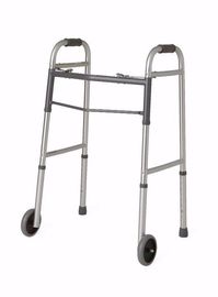 Our lightweight 2 button folding adult walker has 5" wheels, a 300 lb weight capacity, and has a wide adjustable height range.