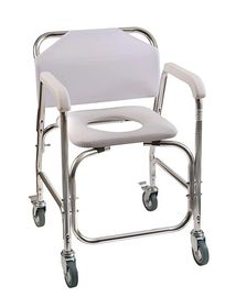 Easily move your loved ones or patients in and out of the shower or commode with our high quality shower chair with wheels. Made of anodized rust free aluminum for years of use. The seat height is 21 inches, seat size is 16 by 16 inches, and overall size is 24 by 22 by 34 inches. Weighs only 18 pounds and supports up to 250 pounds.Waterproof pvc back rest with comfortable padded vinyl seat that makes it comfortable to sit for longer periods in the shower or on the commode. The armrests are comfortable and offer stability in the shower while making it easier to sit and rise.