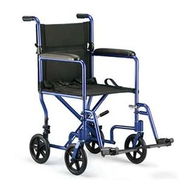 Our transport chair is a compact, lightweight aluminum design with an easy-to-maintain finish. The flared handles and handy back-release hinge allow the back to fold down flat and compact for easy storage and transport. Comes complete with seat belt, tool-free swing-away composite footrests and heel loops. Fits patient weights up to 300 pounds. Comes in Blue or Burgundy, other colors can be special ordered.